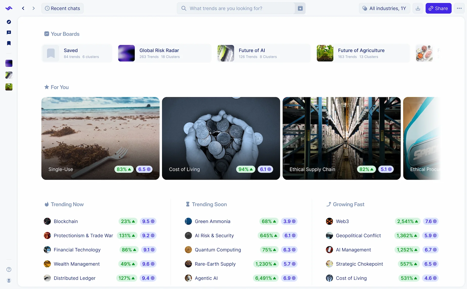 Trendtracker is a B2B foresight and strategic intelligence platform. Over 3 years, I led all design efforts — from brand identity to product design and the commercial website.